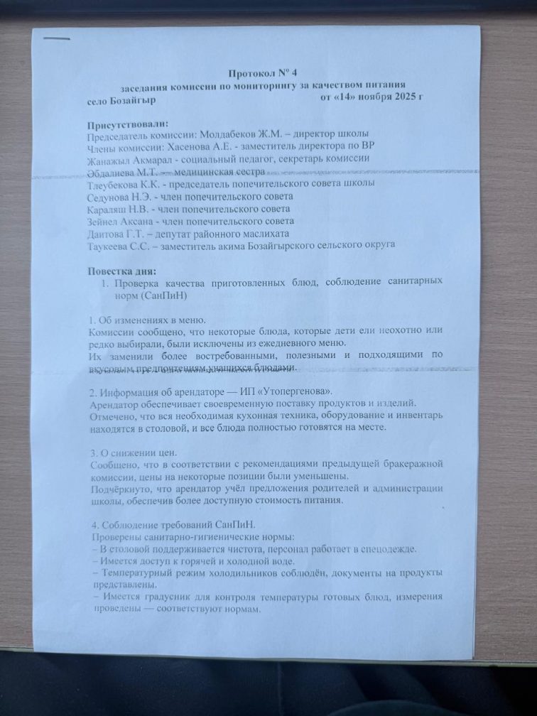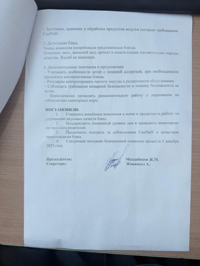 Бүгін мектеп асханасында бракераждық комиссияның жоспарлы тексерісі жүргізілді. Комиссия мүшелері дайындалған тағамдардың сапасын, дәмін, санитарлық талаптарға сәйкестігін және менюдегі өзгерістерді қарап, бағалады. Балалар аз тұтынатын тағамдар менюден алынып, олардың орнына сұранысқа ие, пайдалы әрі дәмді тағамдар енгізілді. Арендатор ИП «Утопергенова» барлық тағамдардың асханада тікелей дайындалатынын, қажетті техника мен жабдықтардың толық екенін атап өтті. Сондай-ақ бұрынғы ұсыныстарға сәйкес кейбір тағамдардың бағасы төмендетілген. Комиссия мүшелері тағамдарды татып көріп, сапасының жақсы екенін атап өтті. СанПиН талаптары орындалуда, температуралық режим тексерілді. Мектеп асханасында балалардың қауіпсіз әрі сапалы тамақтануы тұрақты бақылауда!